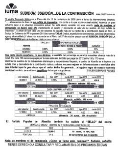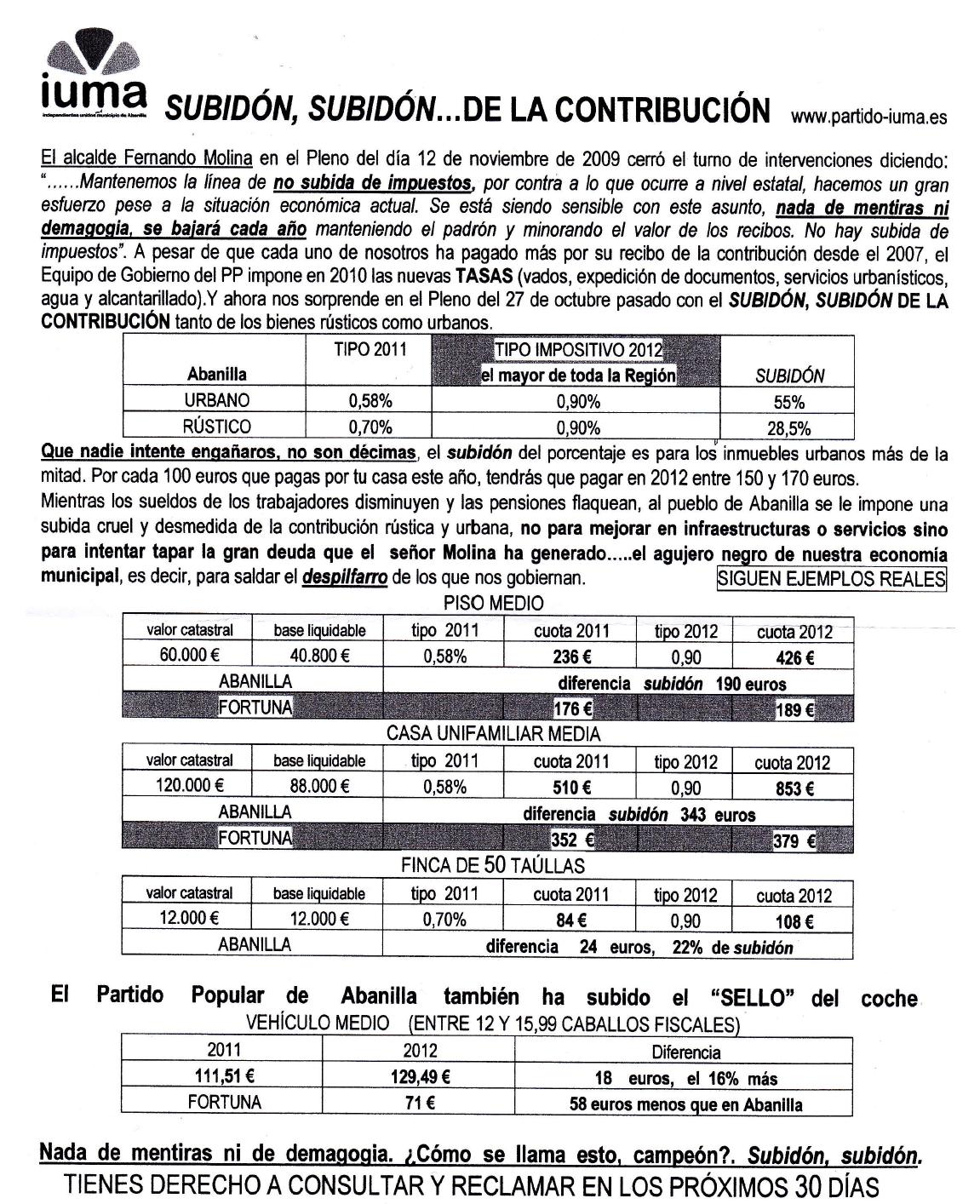 Debido al grave descontrol de las cuentas, o bien se recortaba de la partida de personal, o bien se subían los impuestos. Esto ya se había avisado muchas veces, y ahora ha llegado la hora. La manera más lógica de hacerlo es mediante la subida de los rangos de los porcentajes del impuesto del IBI (urbano y rústico). De esta forma todos los que pagan impuestos en Abanilla pagarán mas en 2012.