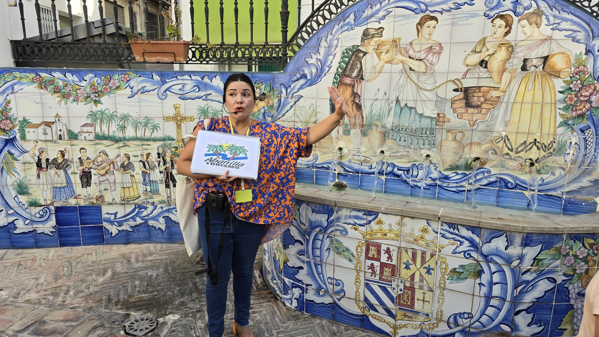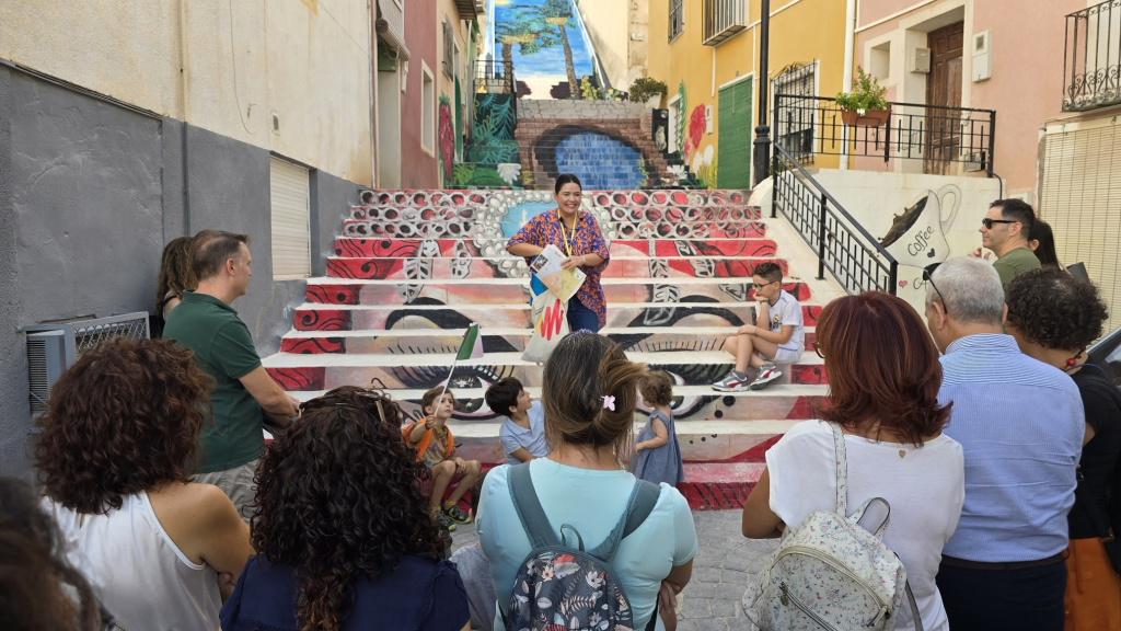 Tras la recepción se procedió a realizar una foto en los soportales del Ayuntamiento, desde donde a continuación, la técnico de turismo y encargada de la Oficina de Turismo, Mª Ángeles Celdrán, comenzó a realizar la visita guiada a los visitantes, la cual se inició en el alto de Constantina, al pie de las escaleras pintadas del Corazón de Jesús, explicando que antes eran blancas y están pintadas desde 2022 las cuales fueron obra de un artista hondureño, Jonatan Rodríguez, e incluyen entre sus colores diversos motivos culturales, paisajes y fauna de Abanilla, así como diversos otros motivos puntuales. De ahí se pasó a la fuente de la calle Mayor, para explicar la procedencia de las aguas de la fuente, así como los motivos que hay reflejados en los azulejos del artista lorquino de la cerámica Lario, quien realizó dicha obra en 1994.