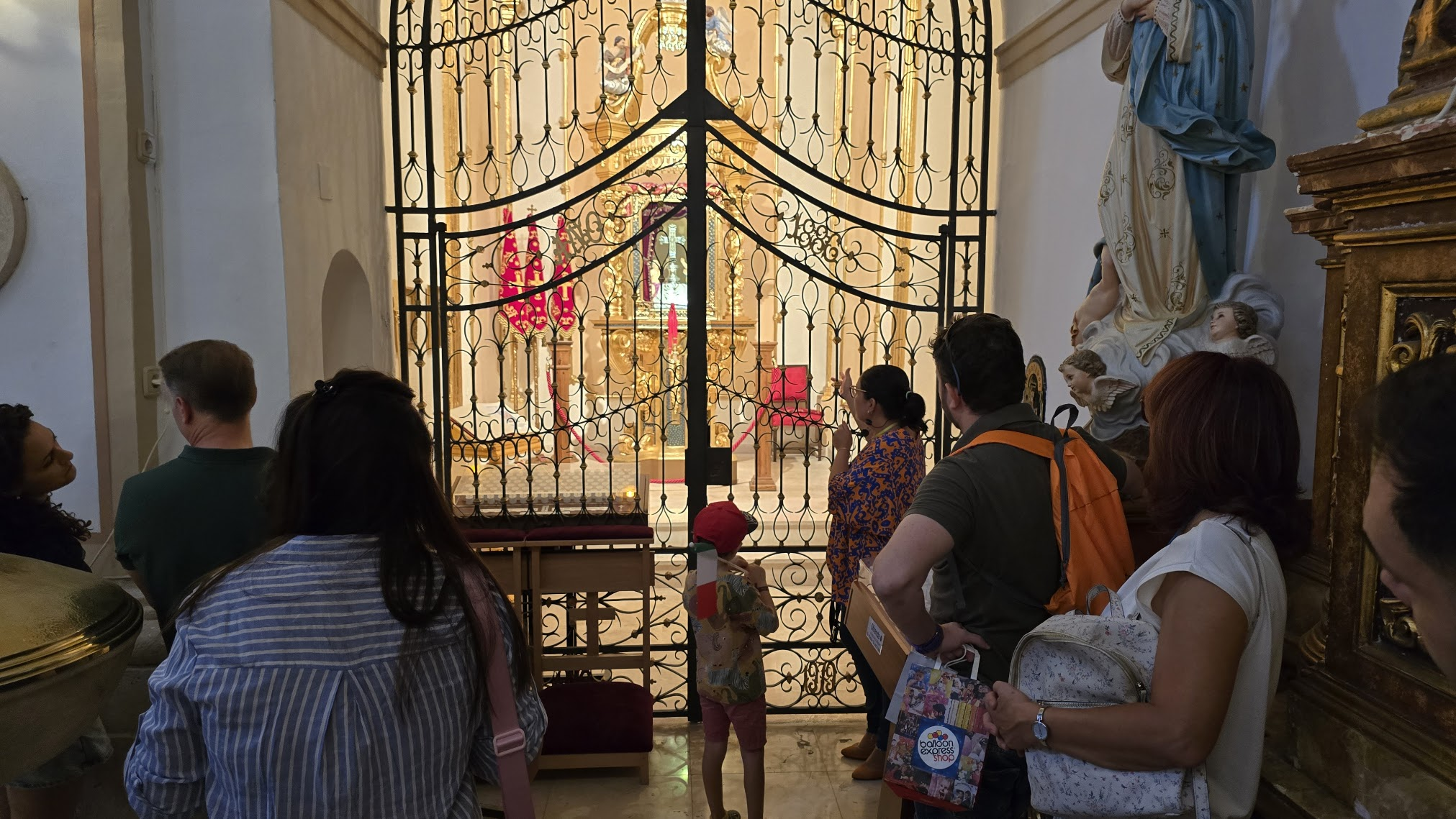 Tras pasar de nuevo frente a la fachada del Ayuntamiento, donde se comentó su origen y funciones, se pasó a la plaza del paje, donde explicó a los personajes de la romería, como lo son los capitanes, tenientes, sargentos, los pajes y los tiradores, en general. Tras visitar el lavadero y relatar la importancia que tuvo para la higiene de los abanilleros cuando aún no había lavadoras, así como el hecho de que aún se mantenga activo y abierto para los visitantes, pese a no ser tan utilizado realmente, los visitantes volvieron sobre sus pasos para acceder a la parroquia de san José, donde pudieron conocer más de cerca la fachada, el retablo, algunos de las imágenes, así como también vieron a la patrona de Abanilla, la Stma. Cruz. Al término de la visita, Roberto Petriaggi hizo entrega a Mª Ángeles de un regalo en nombre de la asociación, en agradecimiento por el detalle de realizar esta visita.
