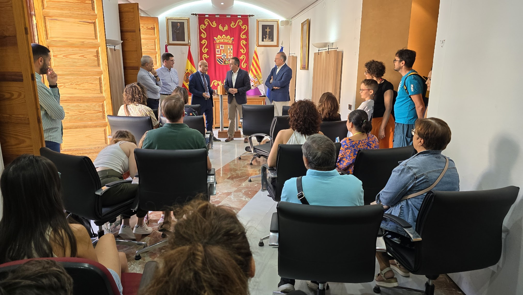 La treintena de italianos, familiares y amigos que formaban el conjunto de la comitiva, se dieron cita a las 9:30 en la plaza de la Constitución, donde a las 10 horas el Alcalde José Antonio Blasco y el concejal Manuel Carlos Cutillas les dieron la bienvenida al municipio y al salón de plenos del Ayuntamiento, procediendo a agradecer a Roberto la propuesta de la realización y la organización de la jornada así como también a la Junta Directiva de la asociación la decisión de llevarla a cabo. Tras explicar las características generales de Abanilla como municipio y los parabienes de vivir en Abanilla, por la consabida hospitalidad de sus vecinos y la cantidad de servicios y oportunidades, como la cercanía a importantes núcleos de población, también comentó la relevancia de las fiestas patronales de Abanilla en honor de la Santísima Cruz, así como las de Moros y Cristianos, presentando a continuación al secretario de la Federación de Moros y Cristianos, Manuel Martínez Pérez, que se hallaba presente entre los asistentes.